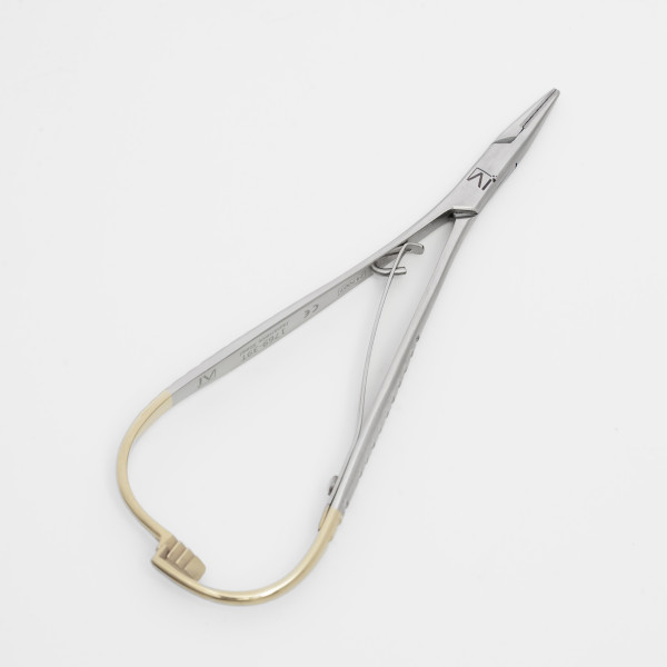 Зажим Мэтью с узкими щечками для работы с металлическими лигатурами.